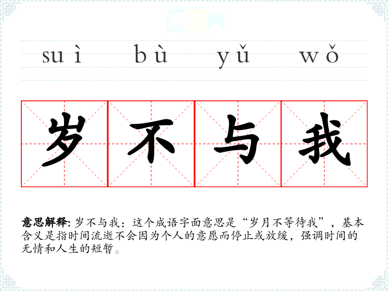 岁不与我:这个成语字面意思是“岁月不等待我”,基本含义是指时间流逝不会因为个人的意愿而停止或放缓,强调时间的无情和人生的短暂。