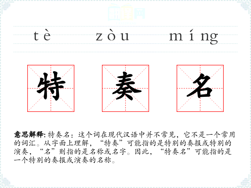 由于“特奏名”不是一个常用词汇,它在不同的语境中可能没有特定的使用。在古代文献或特定的历史背景下,它可能指的是某个特别的奏章或奏乐的名称。