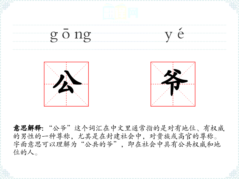 “公爷”这个词汇在中文里通常指的是对有地位、有权威的男性的一种尊称,尤其是在封建社会中,对贵族或高官的尊称。字面意思可以理解为“公共的爷”,即在社会中具有公共权威和地位的人。