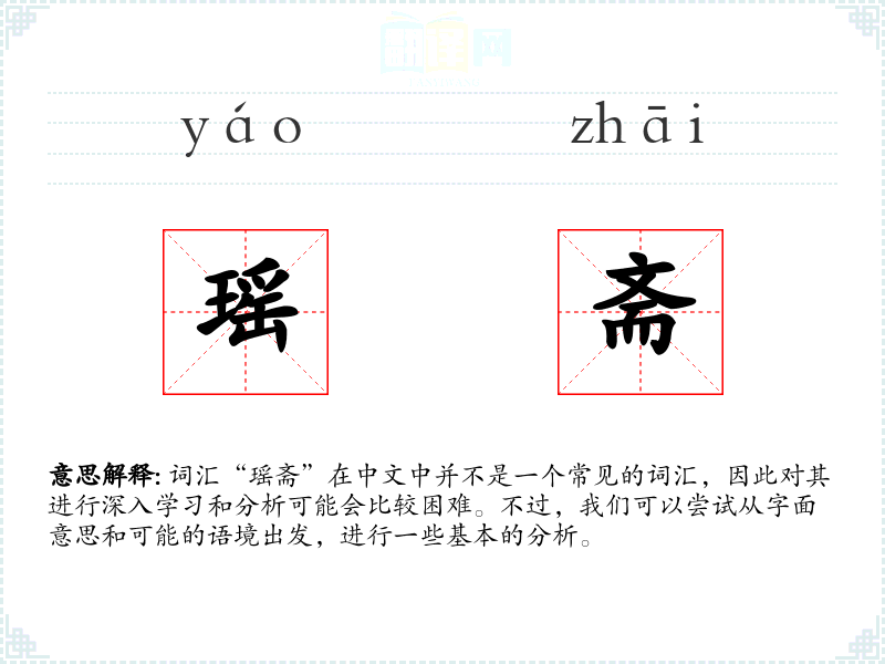词汇“瑶斋”在中文中并不是一个常见的词汇,因此对其进行深入学*和分析可能会比较困难。不过,我们可以尝试从字面意思和可能的语境出发,进行一些基本的分析。