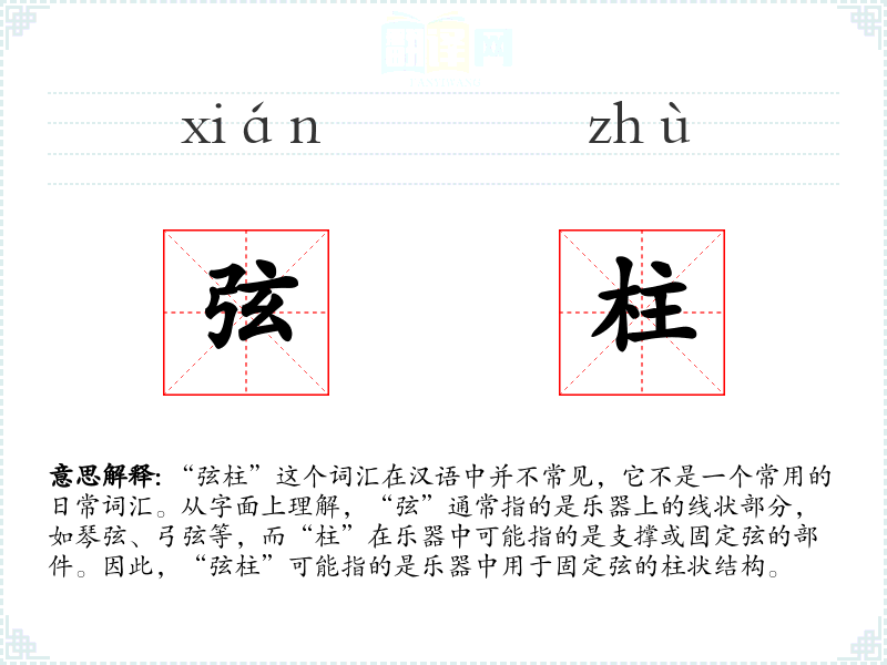 “弦柱”这个词汇的词源较为直接,由“弦”和“柱”两个字组成,没有复杂的历史演变。在古代,乐器的制作和使用非常普遍,因此相关的词汇也较为丰富。