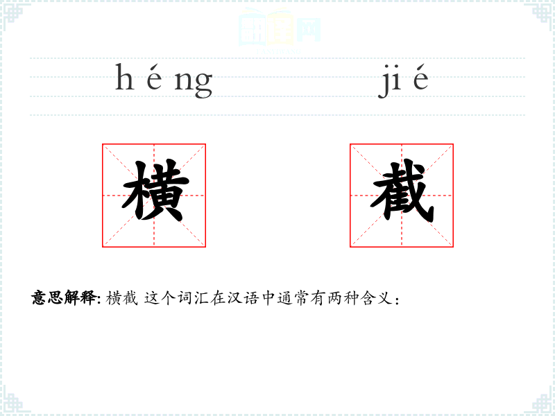 “横截”一词源于古代汉语,其中“横”指横向,“截”指切割或截断。在现代汉语中,其使用范围和含义基本保持不变,但在不同领域有不同的专业用法。