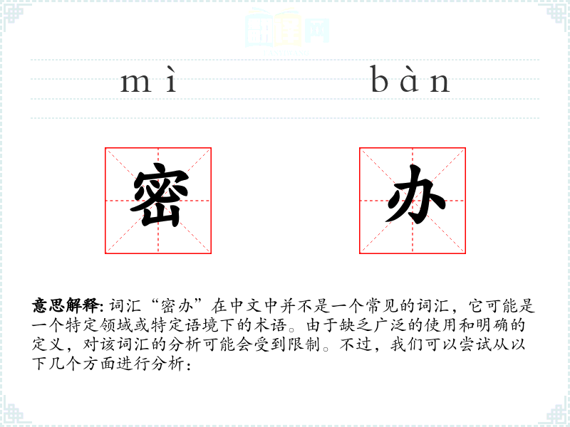 词汇“密办”在中文中并不是一个常见的词汇,它可能是一个特定领域或特定语境下的术语。由于缺乏广泛的使用和明确的定义,对该词汇的分析可能会受到限制。不过,我们可以尝试从以下几个方面进行分析: