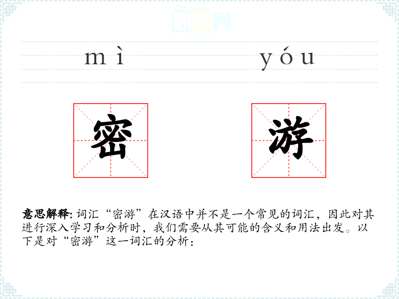 词汇“密游”在汉语中并不是一个常见的词汇,因此对其进行深入学习和分析时,我们需要从其可能的含义和用法出发。以下是对“密游”这一词汇的分析: