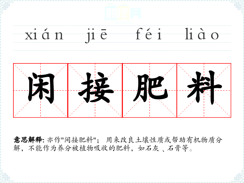 亦作"间接肥料"; 用来改良土壤性质或帮助有机物质分解,不能作为养分被植物吸收的肥料,如石灰﹑石膏等。