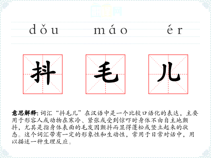 词汇“抖毛儿”在汉语中是一个比较口语化的表达,主要用于形容人或动物在寒冷、紧张或受到惊吓时身体不由自主地颤抖,尤其是指身体表面的毛发因颤抖而显得蓬松或竖立起来的状态。这个词汇带有一定的形象性和生动性,常用于日常对话中,用以描述一种生理反应。
