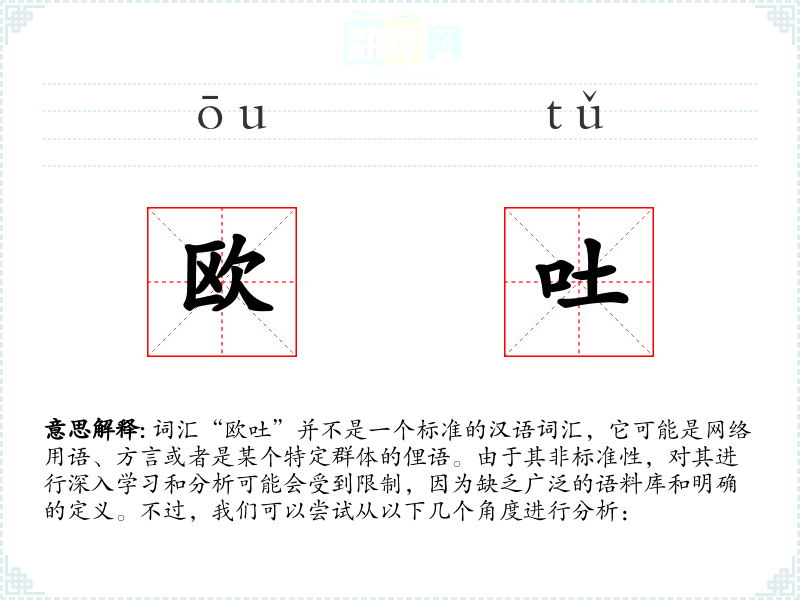 由于“欧吐”不是一个标准词汇,我们无法给出确切的字面意思和基本含义。它可能是某个地区或群体的特定表达方式,或者是网络上的新兴词汇。
