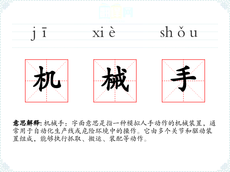 机械手:字面意思是指一种模拟人手动作的机械装置,通常用于自动化生产线或危险环境中的操作。它由多个关节和驱动装置组成,能够执行抓取、搬运、装配等动作。