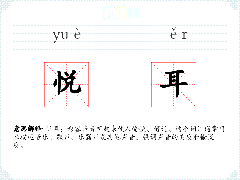 - 词源:悦耳由“悦”和“耳”两个字组成,悦意为愉快,耳指耳朵,合起来即声音使耳朵感到愉快。