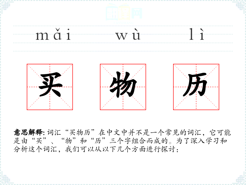 词汇“买物历”在中文中并不是一个常见的词汇,它可能是由“买”、“物”和“历”三个字组合而成的。为了深入学习和分析这个词汇,我们可以从以下几个方面进行探讨: