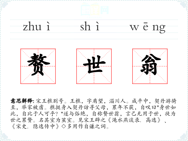 1.宋王樵别号。王樵,字肩望,淄川人。咸平中,契丹游骑至,举家被虏。樵挺身入契丹访寻父母,累年不获,自叹曰"身世如此,自比于人可乎?"遂与俗绝,自称赘世翁,言己无用于世,徒为世之累赘。名其室为茧室。见宋王辟之《渑水燕谈录.高逸》﹑《宋史.隐逸传中》◇多用作自谦之词。