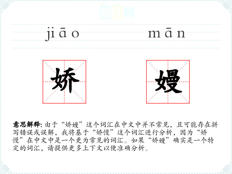 由于“娇嫚”这个词汇在中文中并不常见,且可能存在拼写错误或误解,我将基于“娇慢”这个词汇进行分析,因为“娇慢”在中文中是一个更为常见的词汇。如果“娇嫚”确实是一个特定的词汇,请提供更多上下文以便准确分析。