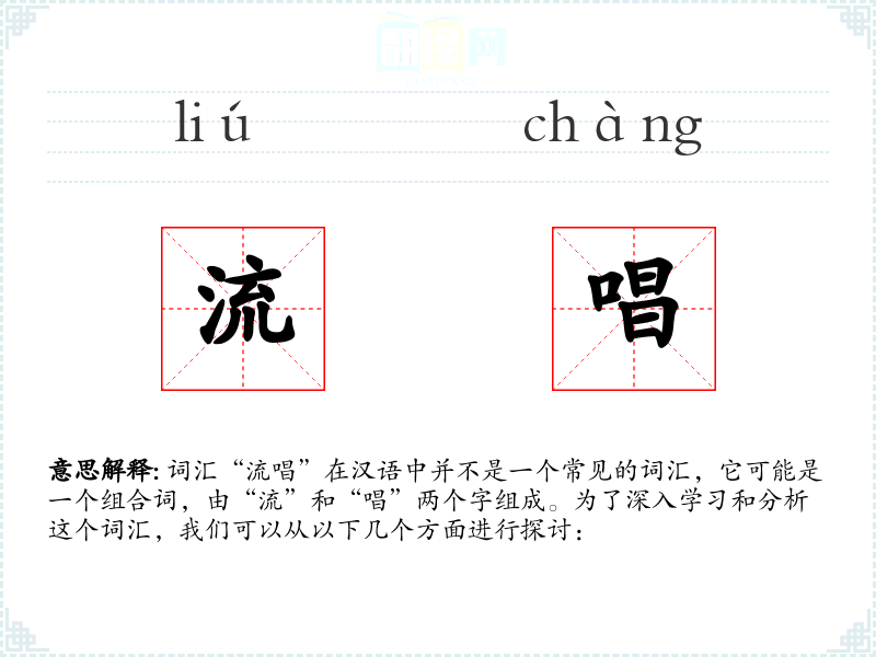 词汇“流唱”在汉语中并不是一个常见的词汇,它可能是一个组合词,由“流”和“唱”两个字组成。为了深入学习和分析这个词汇,我们可以从以下几个方面进行探讨: