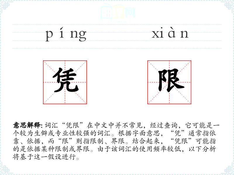 词汇“凭限”在中文中并不常见,经过查询,它可能是一个较为生僻或专业性较强的词汇。根据字面意思,“凭”通常指依靠、依据,而“限”则指限制、界限。结合起来,“凭限”可能指的是依据某种限制或界限。由于该词汇的使用频率较低,以下分析将基于这一假设进行。