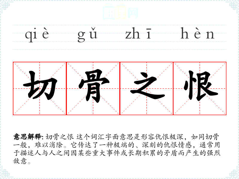切骨之恨 这个词汇字面意思是形容仇恨极深,如同切骨一般,难以消除。它传达了一种极端的、深刻的仇恨情感,通常用于描述人与人之间因某些重大**或长期积累的矛盾而产生的强烈敌意。