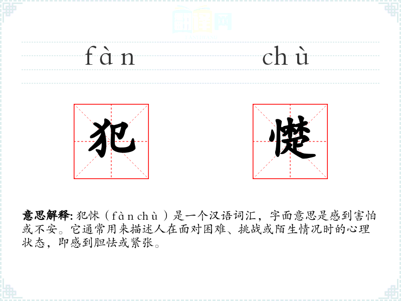 犯怵(fàn chù)是一个汉语词汇,字面意思是感到害怕或不安。它通常用来描述人在面对困难、挑战或陌生情况时的心理状态,即感到胆怯或紧张。