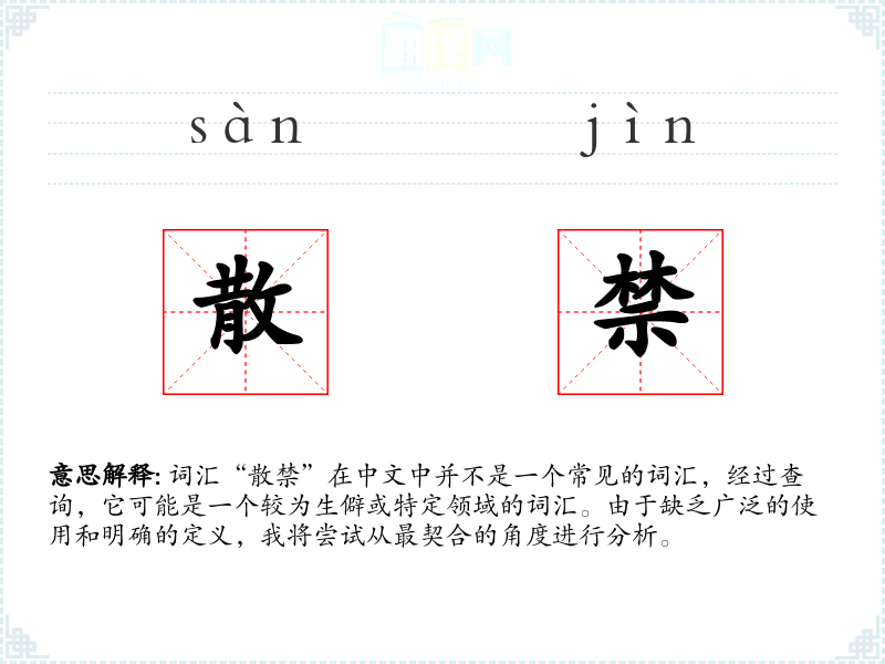 词汇“散禁”在中文中并不是一个常见的词汇,经过查询,它可能是一个较为生僻或特定领域的词汇。由于缺乏广泛的使用和明确的定义,我将尝试从最契合的角度进行分析。