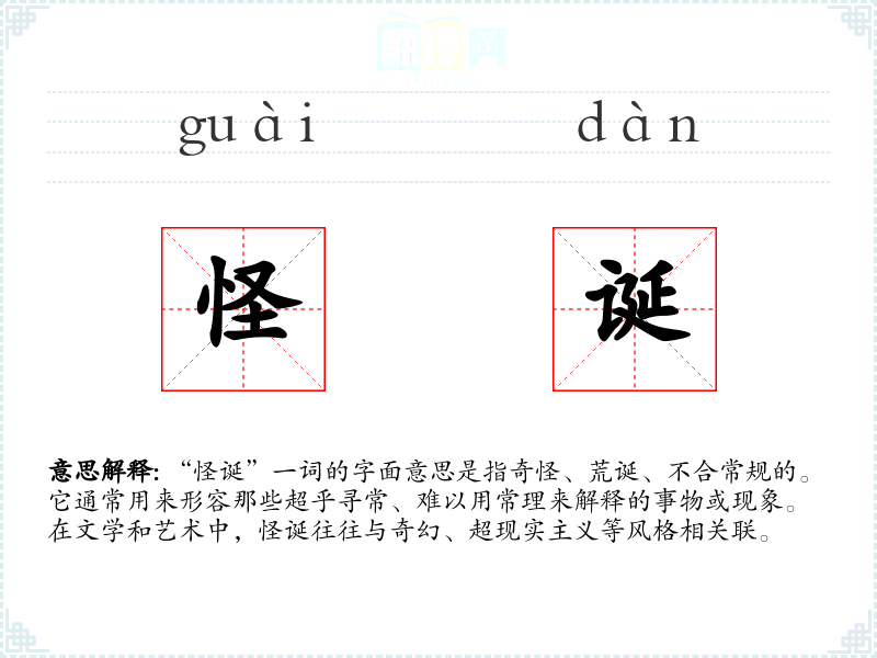 “怪诞”一词的字面意思是指奇怪、荒诞、不合常规的。它通常用来形容那些超乎寻常、难以用常理来解释的事物或现象。在文学和艺术中,怪诞往往与奇幻、超现实主义等风格相关联。