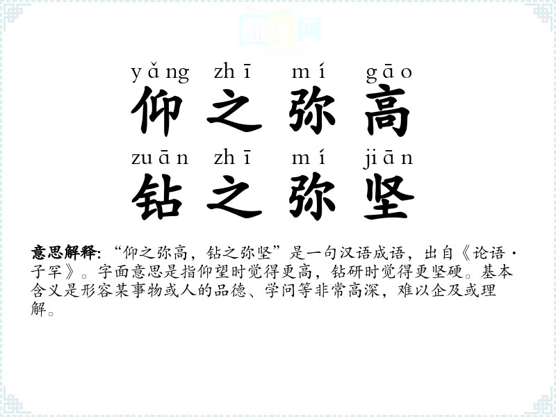 “仰之弥高,钻之弥坚”是一句汉语成语,出自《论语·子罕》。字面意思是指仰望时觉得更高,钻研时觉得更坚硬。基本含义是形容某事物或人的品德、学问等非常高深,难以企及或理解。