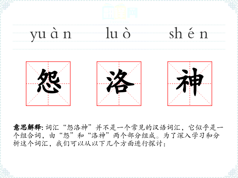 词汇“怨洛神”并不是一个常见的汉语词汇,它似乎是一个组合词,由“怨”和“洛神”两个部分组成。为了深入学*和分析这个词汇,我们可以从以下几个方面进行探讨: