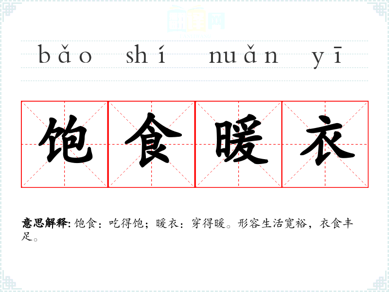 饱食:吃得饱;暖衣:穿得暖。形容生活宽裕,衣食丰足。