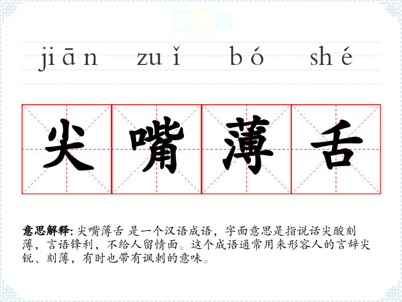 *尖嘴舌* 是一个汉语成语,字面意思是指说话尖酸刻,言语锋利,不给人留情面。这个成语通常用来形容人的言辞尖锐、刻*,有时也带有讽刺的意味。