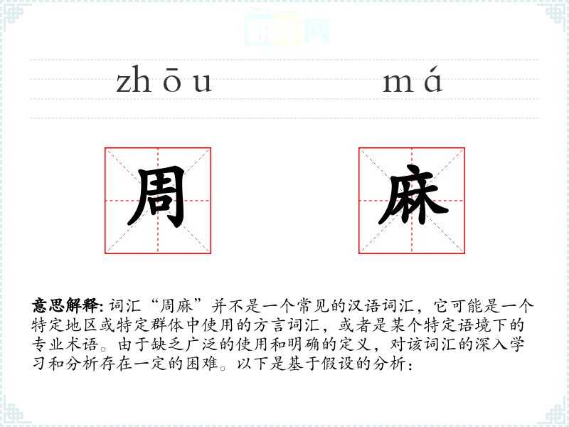 由于“周麻”不是一个标准汉语词汇,我们无法提供一个确切的字面意思和基本含义。它可能是由“周”和“麻”两个字组合而成的,但具体含义需要结合具体语境来解释。