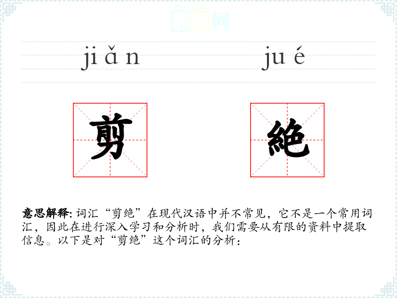 词汇“剪绝”在现代汉语中并不常见,它不是一个常用词汇,因此在进行深入学习和分析时,我们需要从有限的资料中提取信息。以下是对“剪绝”这个词汇的分析: