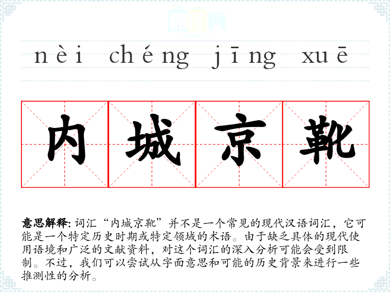 词汇“内城京靴”并不是一个常见的现代汉语词汇,它可能是一个特定历史时期或特定领域的术语。由于缺乏具体的现代使用语境和广泛的文献资料,对这个词汇的深入分析可能会受到限制。不过,我们可以尝试从字面意思和可能的历史背景来进行一些推测性的分析。