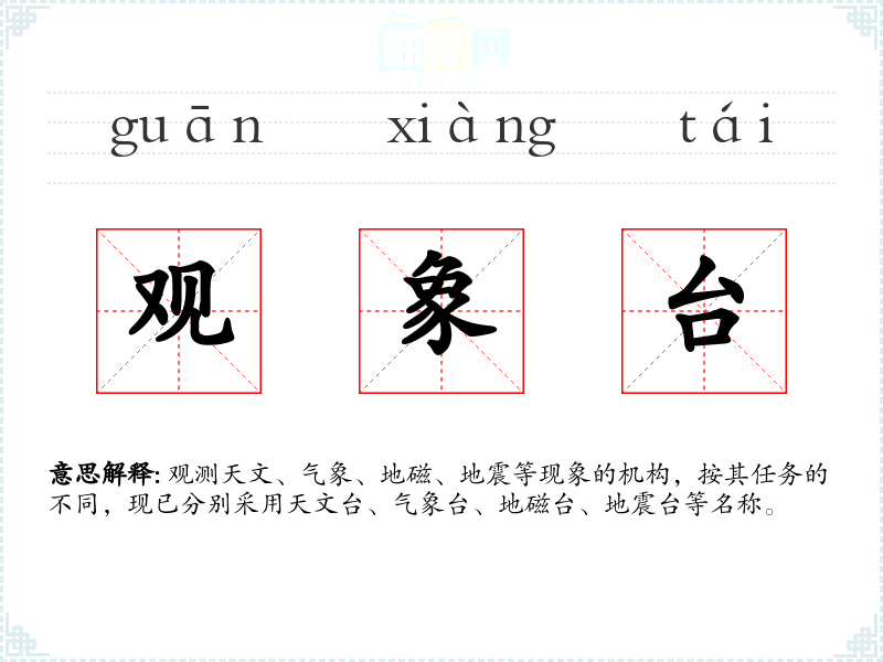观测天文、气象、地磁、地震等现象的机构,按其任务的不同,现已分别采用天文台、气象台、地磁台、地震台等名称。