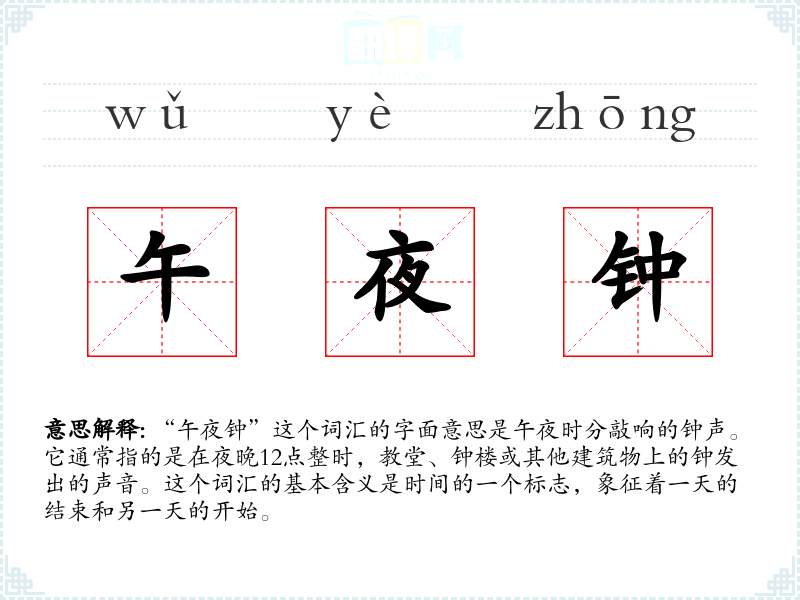 “午夜钟”这个词汇的字面意思是午夜时分敲响的钟声。它通常指的是在夜晚12点整时,教堂、钟楼或其他建筑物上的钟发出的声音。这个词汇的基本含义是时间的一个标志,象征着一天的结束和另一天的开始。