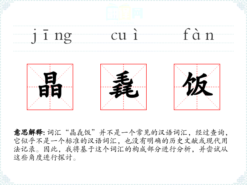 词汇“晶毳饭”并不是一个常见的汉语词汇,经过查询,它似乎不是一个标准的汉语词汇,也没有明确的历史文献或现代用法记录。因此,我将基于这个词汇的构成部分进行分析,并尝试从这些角度进行探讨。