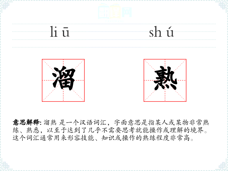 溜熟 是一个汉语词汇,字面意思是指某人或某物非常熟练、熟悉,以至于达到了几乎不需要思考就能操作或理解的境界。这个词汇通常用来形容技能、知识或操作的熟练程度非常高。