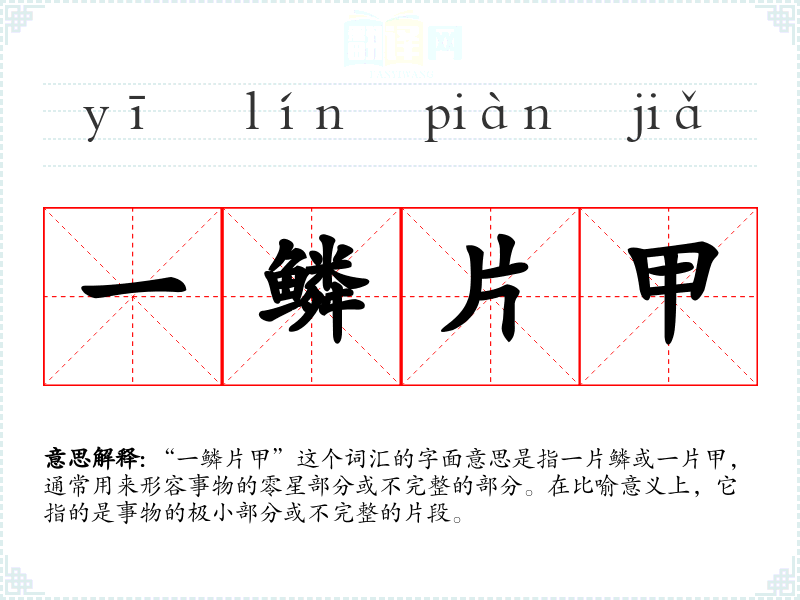 “一鳞片甲”这个词汇的字面意思是指一片鳞或一片甲,通常用来形容事物的零星部分或不完整的部分。在比喻意义上,它指的是事物的极小部分或不完整的片段。