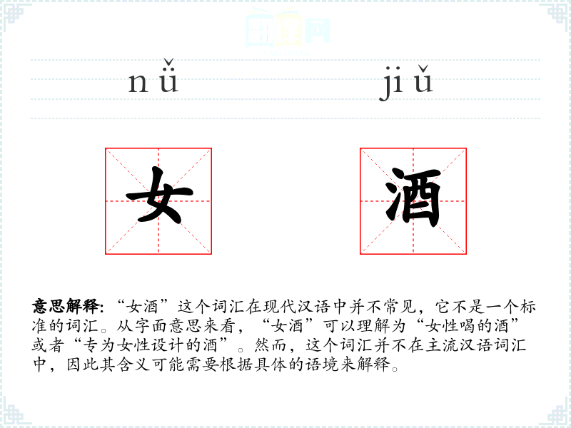 “女酒”这个词汇在现代汉语中并不常见,它不是一个标准的词汇。从字面意思来看,“女酒”可以理解为“女性喝的酒”或者“专为女性设计的酒”。然而,这个词汇并不在主流汉语词汇中,因此其含义可能需要根据具体的语境来解释。