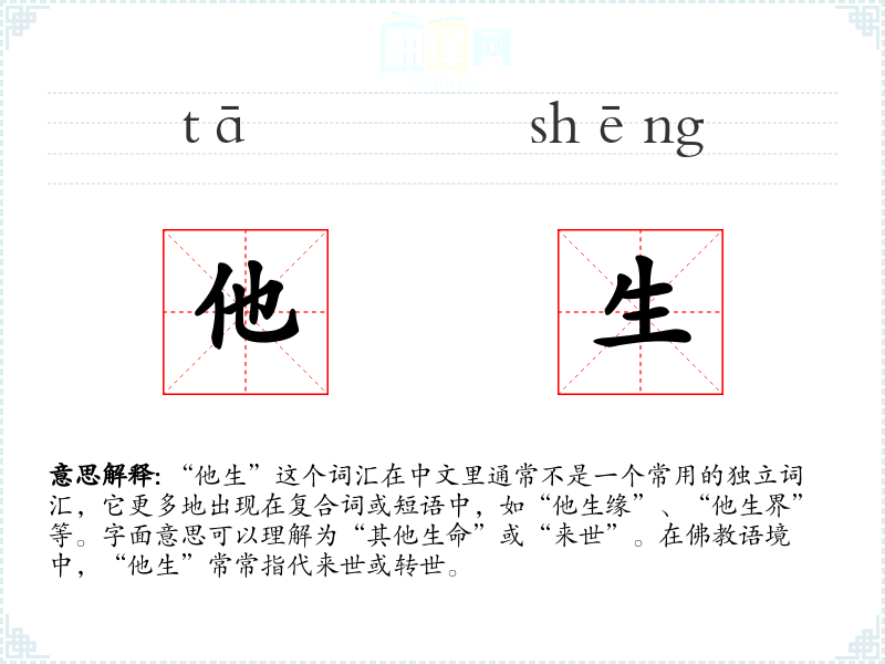 “他生”这个词汇的词源较为直接,由“他”和“生”两个字组成,分别表示“其他的”和“生命”。在古代汉语中,这个词汇可能更多地与**信仰相关,随着时间的推移,其使用范围和含义有所扩展。