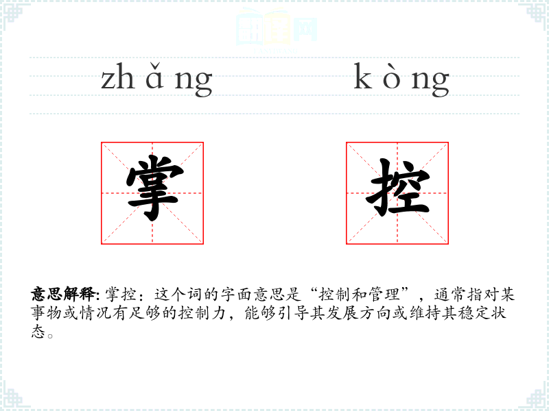 掌控:这个词的字面意思是“控制和管理”,通常指对某事物或情况有足够的控制力,能够引导其发展方向或维持其稳定状态。