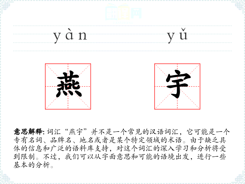 由于“燕宇”不是一个常见的词汇,它的使用语境可能非常有限,可能出现在特定的文学作品、历史文献、地理名称或者商业品牌中。