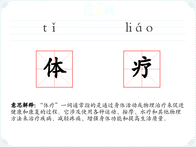 同义词:物理治疗、康复治疗、疗法 反义词**:药物治疗、手术治疗(这些通常是体疗的替代或补充方法)