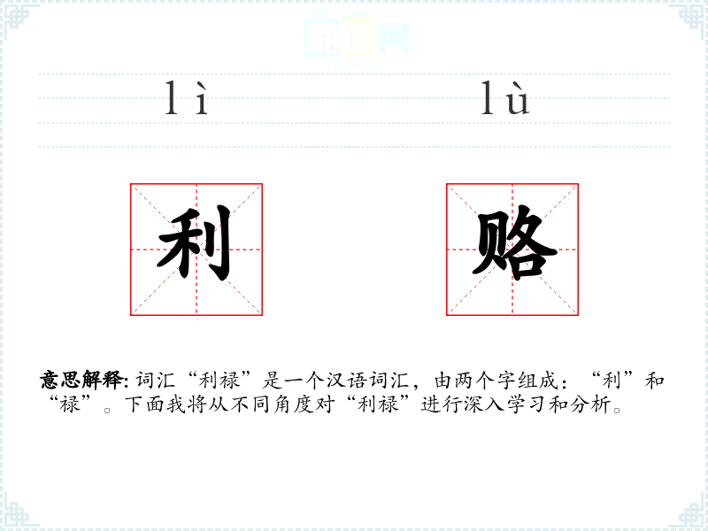 “利禄”字面意思是指利益和俸禄,通常用来指代物质上的好处或官方的薪水。在古代,“利禄”特指官员的俸禄,即朝廷给予官员的报酬,包括金钱和物品。