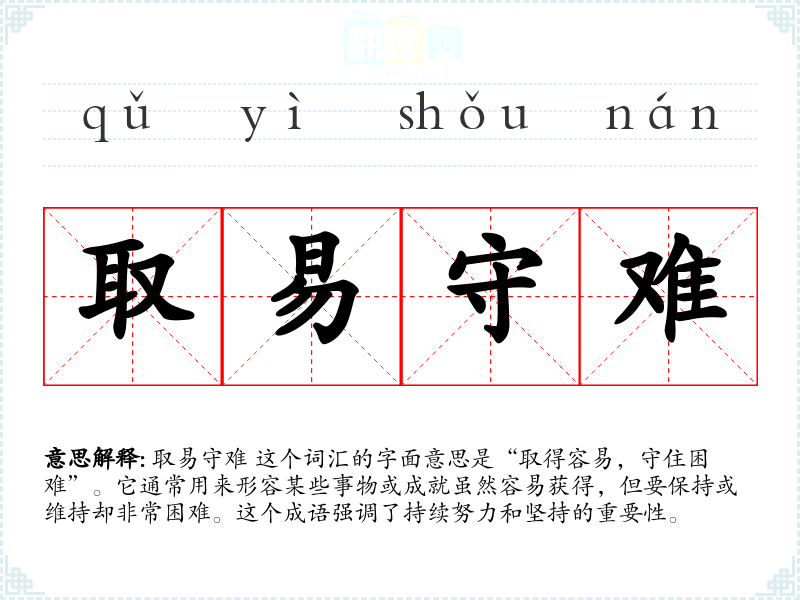 取易守难 这个词汇的字面意思是“取得容易,守住困难”。它通常用来形容某些事物或成就虽然容易获得,但要保持或维持却非常困难。这个成语强调了持续努力和坚持的重要性。