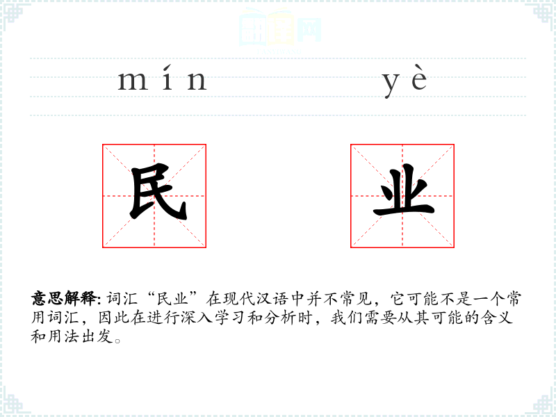 词汇“民业”在现代汉语中并不常见,它可能不是一个常用词汇,因此在进行深入学*和分析时,我们需要从其可能的含义和用法出发。