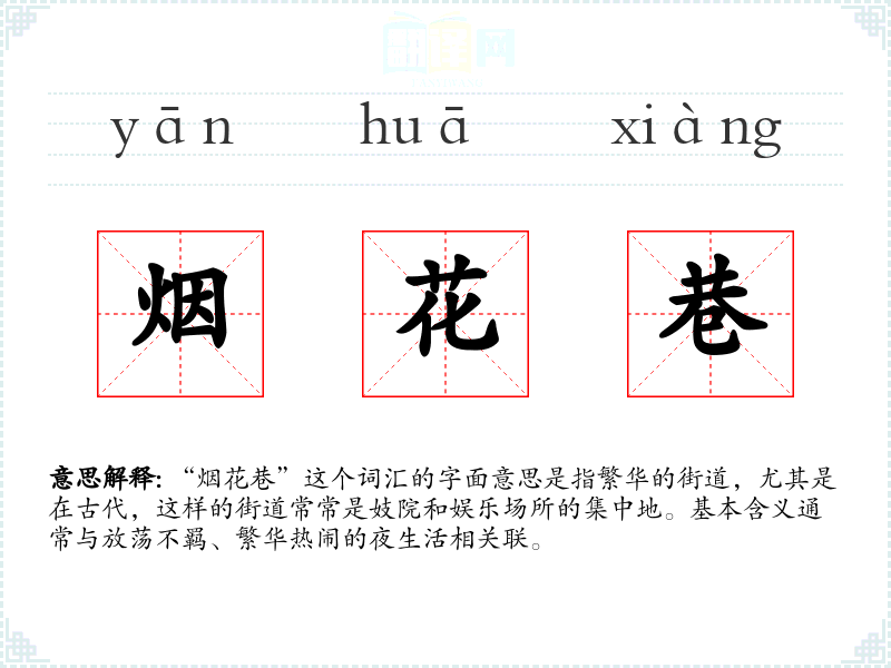 “烟花巷”这个词汇的字面意思是指繁华的街道,尤其是在古代,这样的街道常常是妓院和娱乐场所的集中地。基本含义通常与放荡不羁、繁华热闹的夜生活相关联。