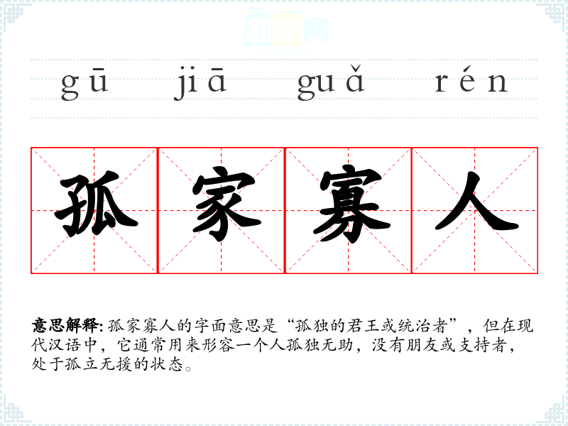 孤家寡人的字面意思是“孤独的君王或统治者”,但在现代汉语中,它通常用来形容一个人孤独无助,没有朋友或支持者,处于孤立无援的状态。