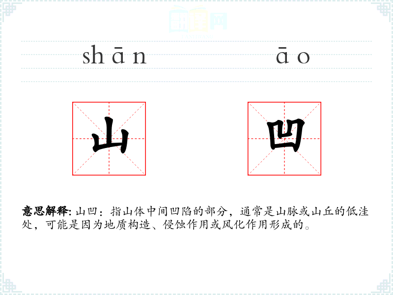 山凹:指山体中间凹陷的部分,通常是山脉或山丘的低洼处,可能是因为地质构造、侵蚀作用或风化作用形成的。