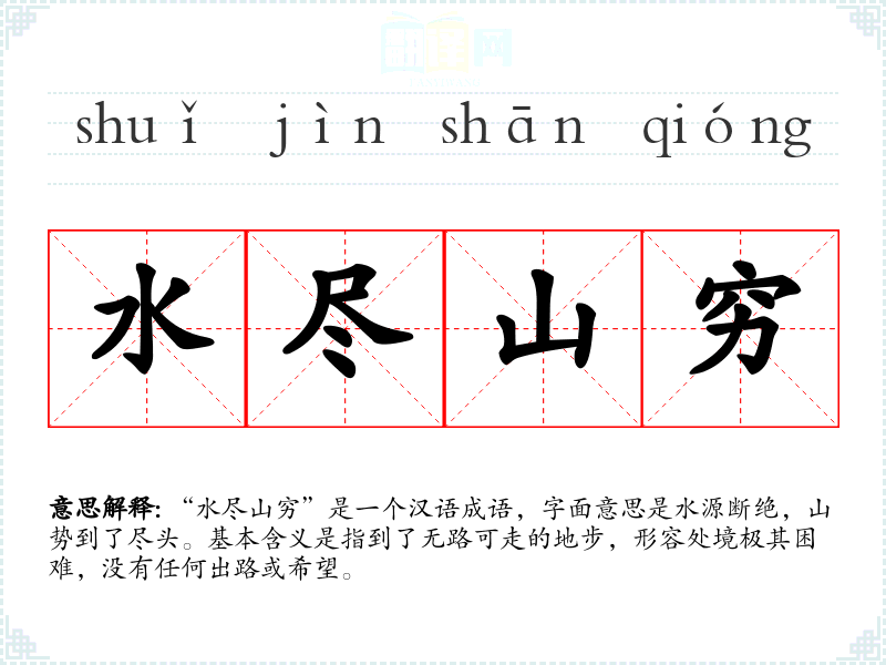 “水尽山穷”是一个汉语成语,字面意思是水源断绝,山势到了尽头。基本含义是指到了无路可走的地步,形容处境极其困难,没有任何出路或希望。