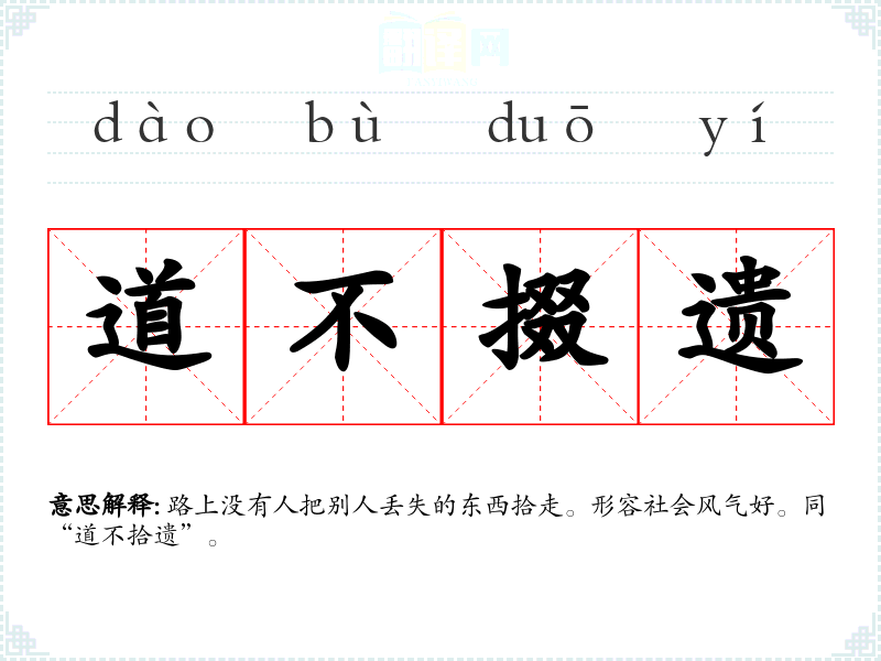路上没有人把别人丢失的东西拾走。形容社会风气好。同“