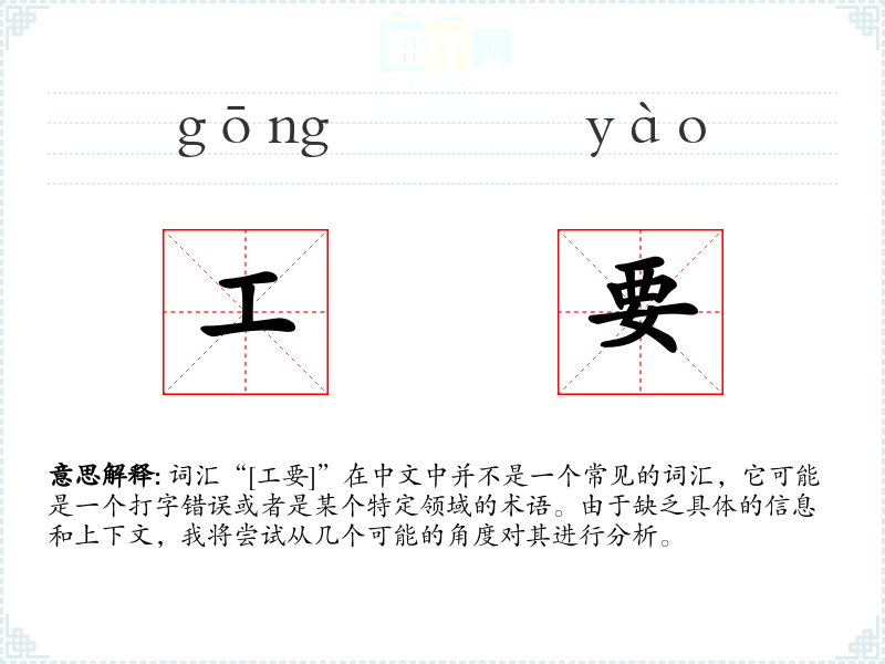 由于“[工要]”不是一个标准的词汇,我们无法给出一个确切的字面意思和基本含义。如果它是一个特定领域的术语,那么它的含义将取决于该领域的专业知识。
