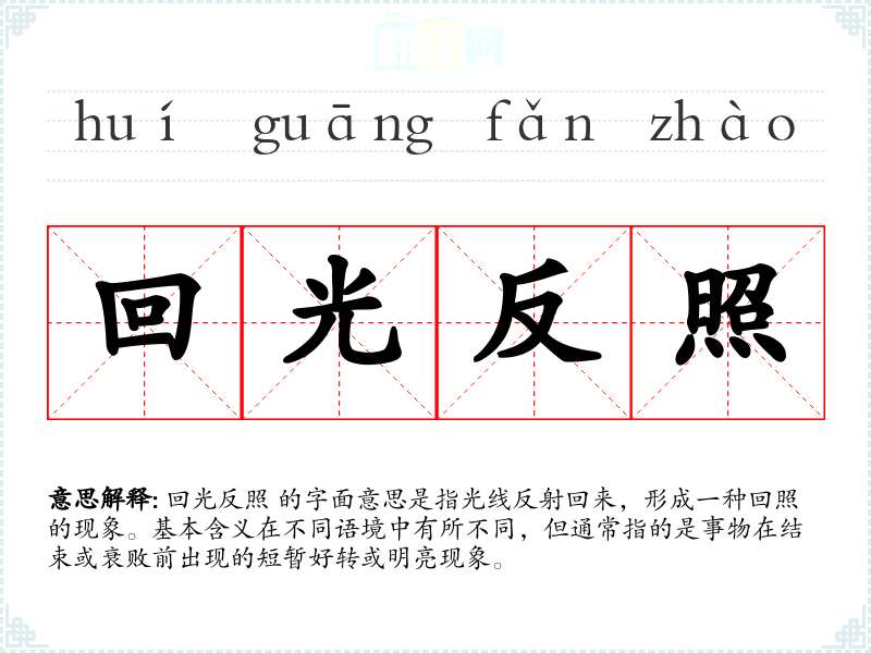回光反照 的字面意思是指光线反射回来,形成一种回照的现象。基本含义在不同语境中有所不同,但通常指的是事物在结束或衰败前出现的短暂好转或明亮现象。