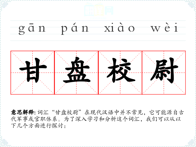 词汇“甘盘校尉”在现代汉语中并不常见,它可能源自古代军事或官职体系。为了深入学*和分析这个词汇,我们可以从以下几个方面进行探讨: